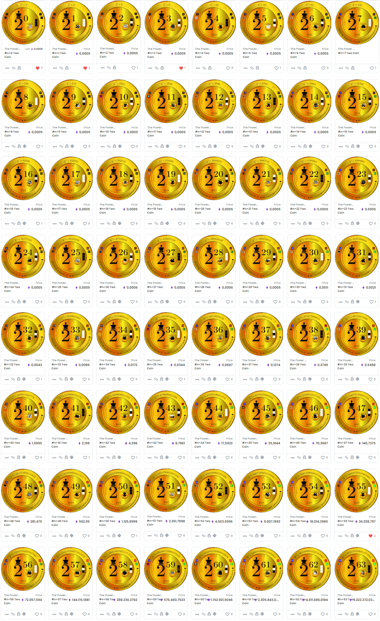 The Power of Two is a collection of 64 items to collect called Two Coins. This price is evaluated in Ethereum (ETH) and the collection is on the Polygon Network. The price of each Two Coin is defined by the power of 2 stamped on it. In order for the last Two Cois not to get too expensive, the price of all items is divided by 1,000,000,000. So we have Two Coin with price ranging from 0.000000000001 to 9,223,372.036854775808 ETH.